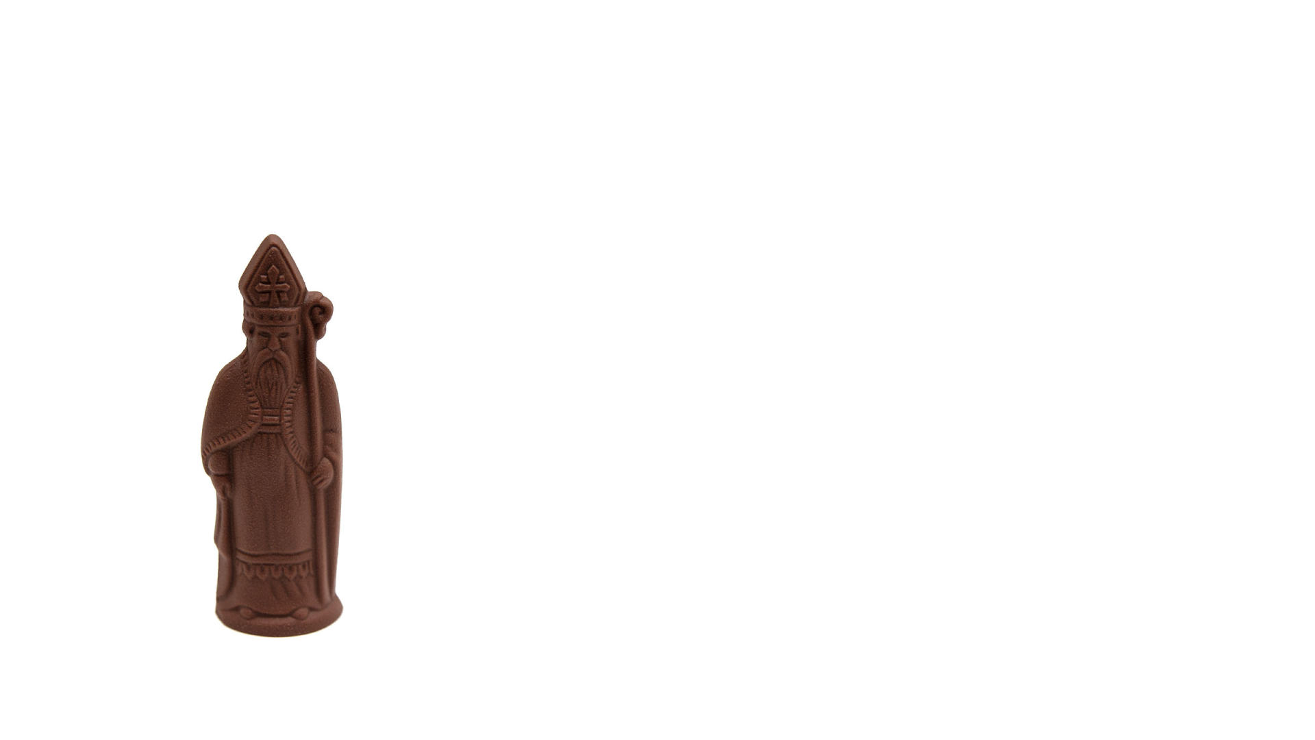 Milk chocolate Saint Nicholas filled with mini milk and dark chocolate waffles Contains: milk, soy, nuts (hazelnuts, almonds)