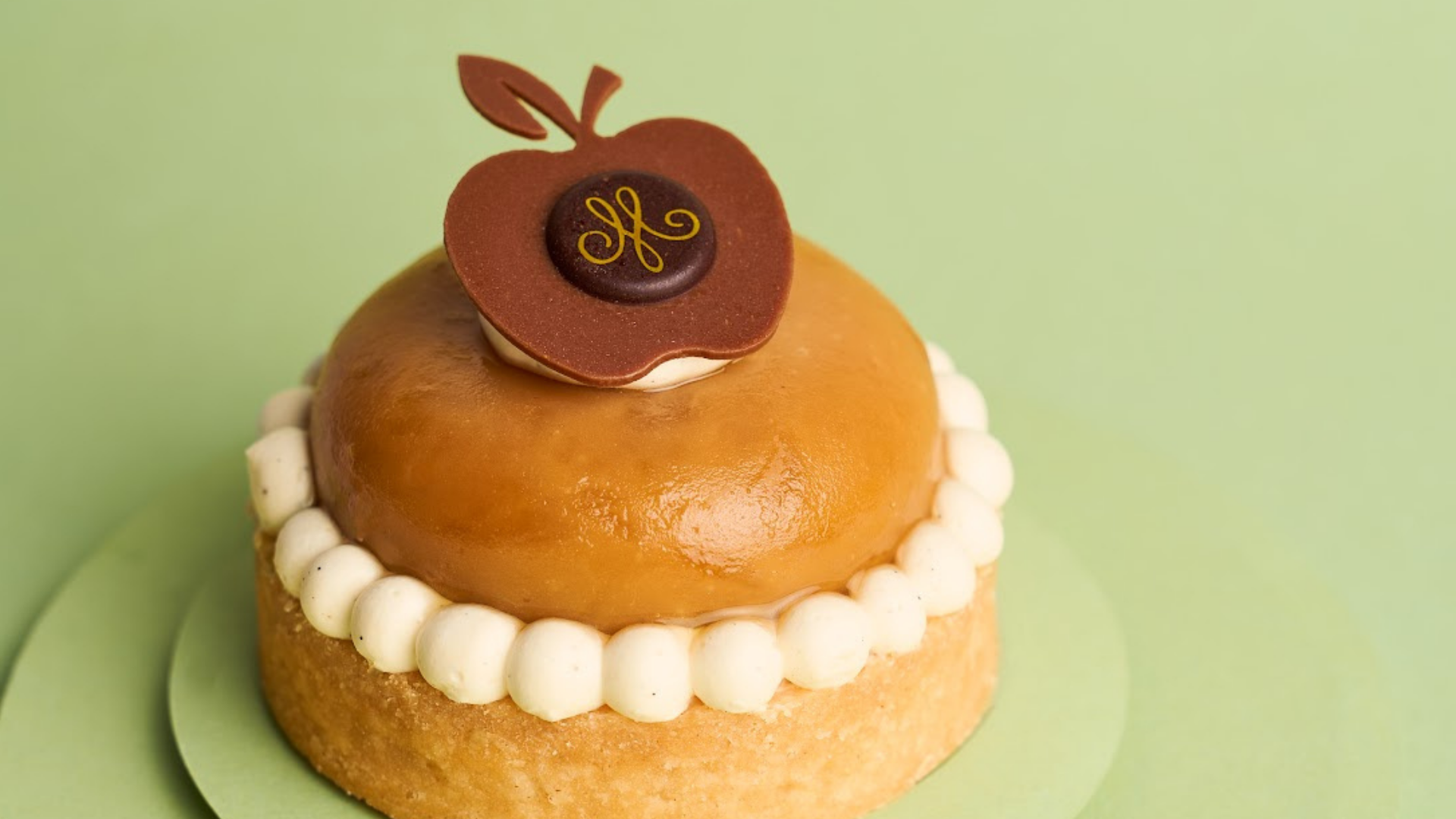 Sweet almond and hazelnut pastry topped with a thin layer of frangipane, smooth vanilla caramel, Madagascar vanilla whipped ganache, apple tart in two textures.