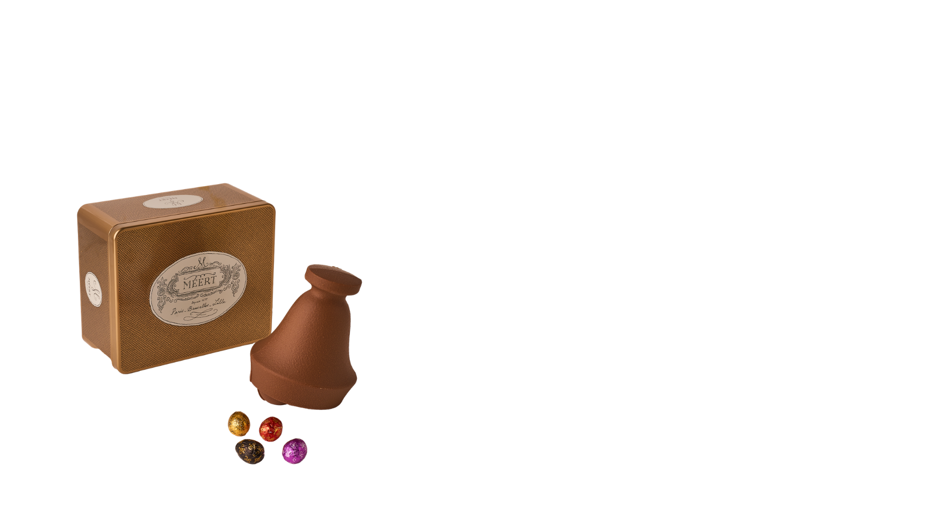Cloche en chocolat noir garnie d'un assortiment de petits oeufs (chocolat au lait, noir et blanc).
