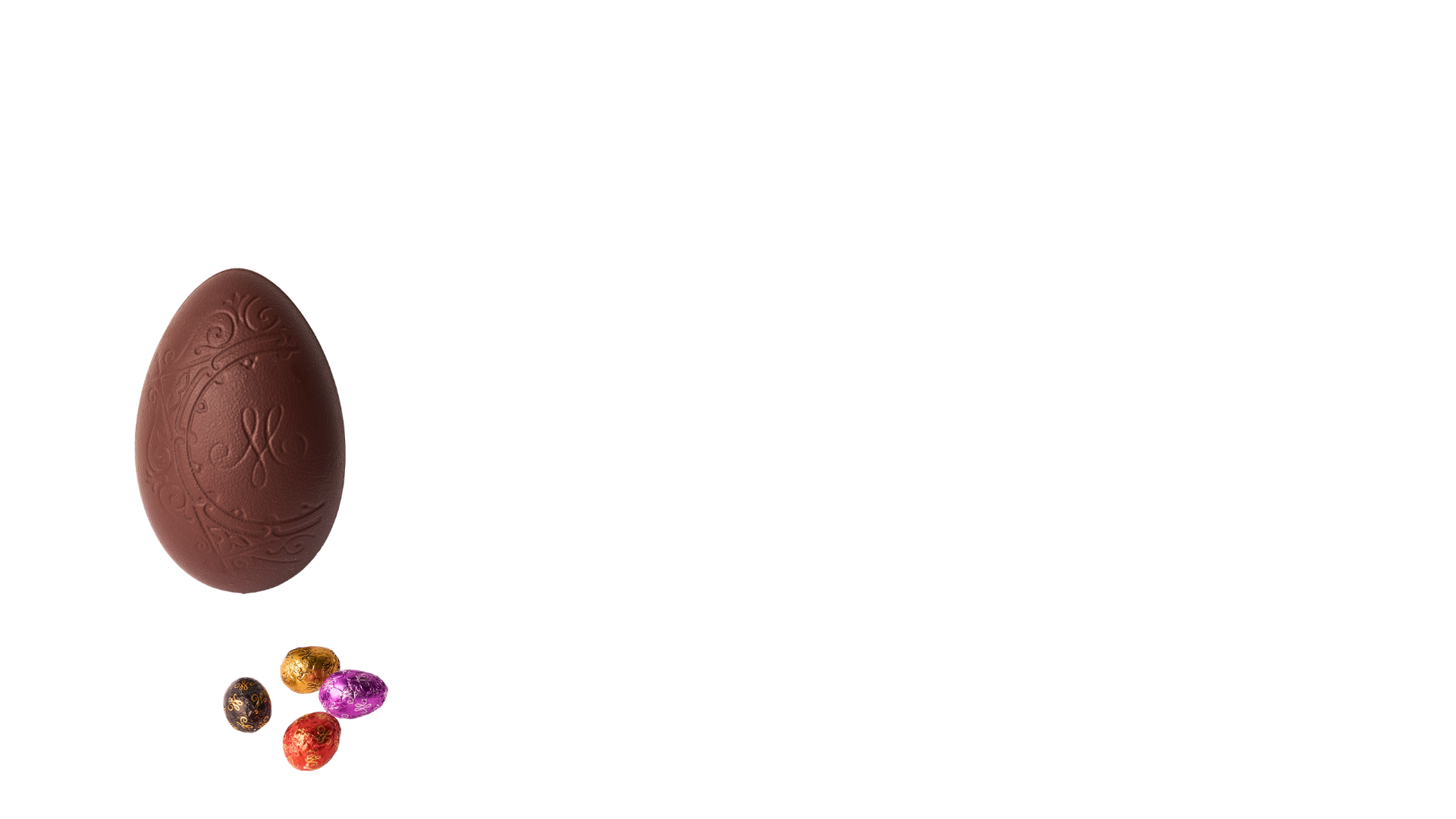 Œuf de Pâques en chocolat noir garni d'un assortiment de petits oeufs (chocolat noir, au lait et blanc).